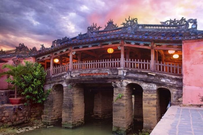 Chùa Cầu vào ban đêm được chiếu sáng nhẹ nhàng, phản chiếu ánh đèn xuống nước tạo nên khung cảnh hoài cổ. Nếu có máy ảnh thuê với khả năng phơi sáng tốt, bạn có thể chụp ảnh ánh phản chiếu trên mặt nước hoặc ảnh cầu + khách du lịch qua lại. -