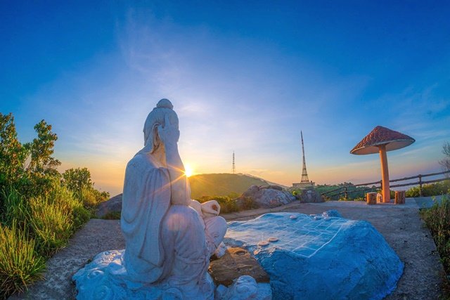 Từ trên cao, bạn có thể ngắm hoàng hôn buông xuống biển và làng chài phía dưới. Vừa có khung cảnh thiên nhiên, vừa có kiến trúc chùa cổ kính, rất phù hợp để chụp ảnh hoàng hôn nghệ thuật.