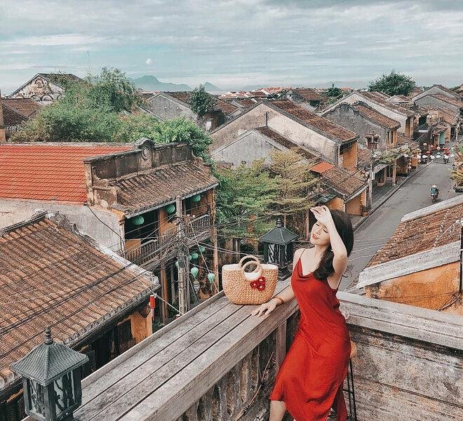 Quán café trên cao có view nhìn xuống phố cổ, đèn lồng, mái nhà cổ. Ban đêm ánh sáng ngoài trời kết hợp đèn quán tạo ra phông nền rất “deep”. Rất thích hợp cho ảnh chân dung nhấn chủ thể + nền phố cổ mờ nhẹ. -